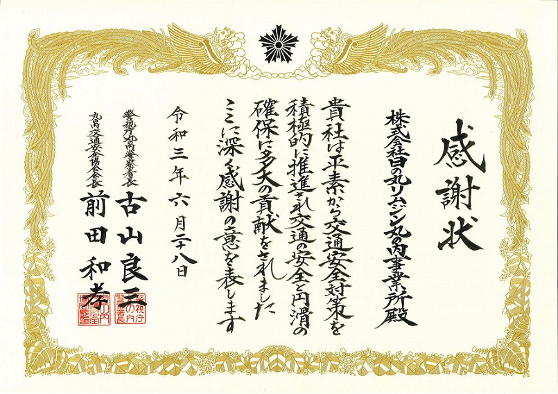 これは、警察署(警視庁)が主催するセーフティードライブコンテストへの全員参加、交通安全運動時における交通マナー啓発のための街宣活動等、当社事業所として平素の積極的な安全確保の多くの取り組みが認められ、今回の表彰に至ったものです。